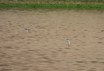 | Fumareles comunes en vuelo y junto a gaviotas reidoras. |